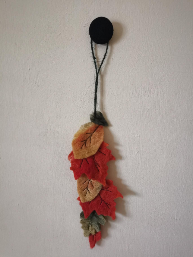 I felted this hanging after a lovely autumn walk at Stourhead gardens, a local national trust property. This is made from Shetland wool, ( British) and measures about 25cm long. It features beech, oak and maple leaves, machine sewn onto a green hessian hanging loop.