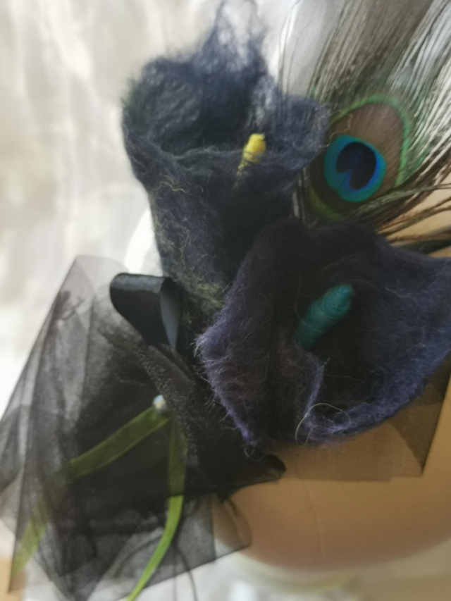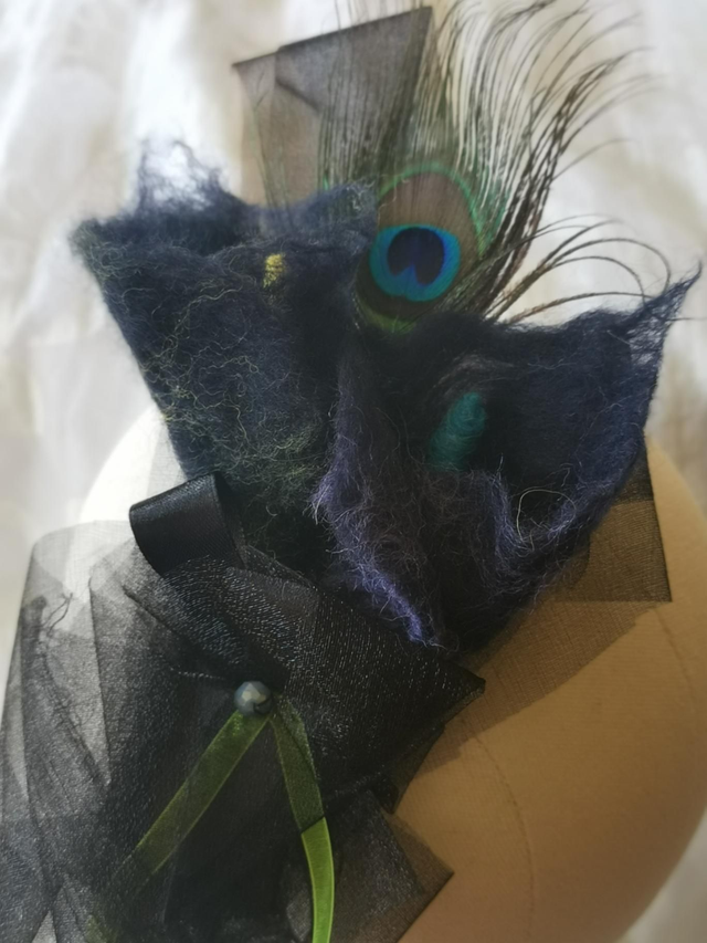 I have crafted this beautiful fascinator from Shetland wool produced in the UK. Two arum lilies of darkest blue with contrasting stamen. I've also added black tuille, neon green ribbon and a little sparkle. The fascinator is attached to a black hair band (I'm happy to change this for lighter hair colours, just message me). It's tied with a loose bow so that you can adjust the position to suit then I suggest you tie it with a knot to secure it.